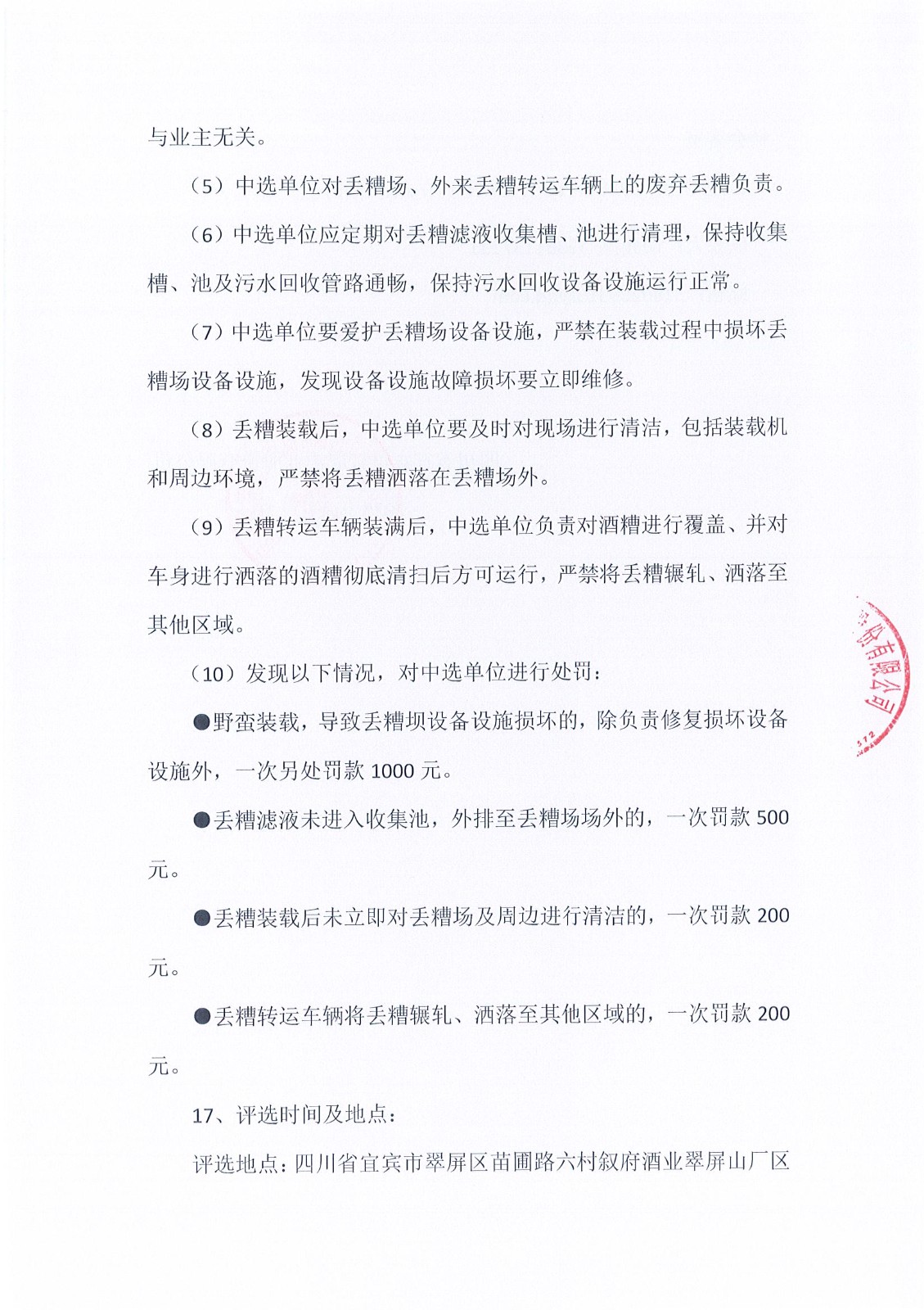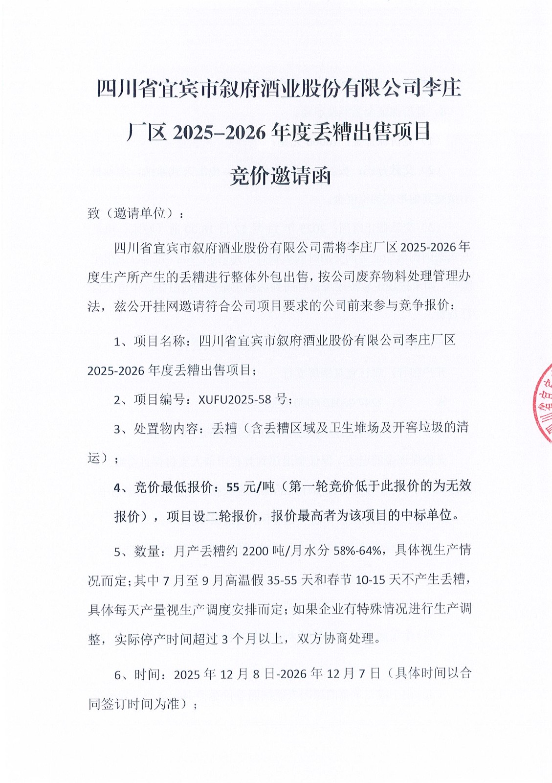 四川省宜賓市敘府酒業(yè)股份有限公司李莊廠(chǎng)區2025-2026年度丟糟出售項目競價(jià)結果公示公告