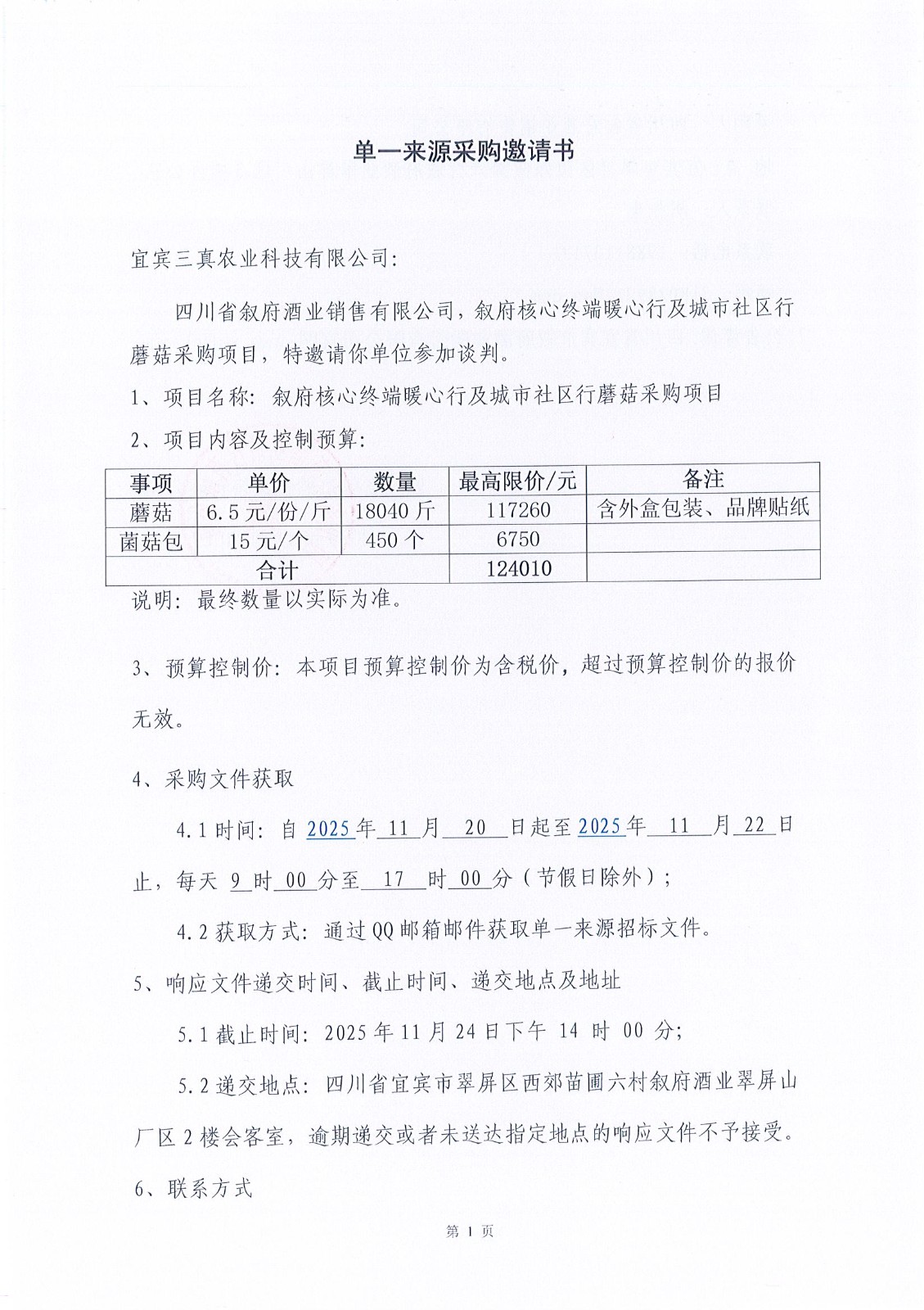 四川省敘府酒業(yè)銷(xiāo)售有限公司敘府核心終端暖心行及城市社區行、蘑菇單一來(lái)源采購項目中標結果公示公告